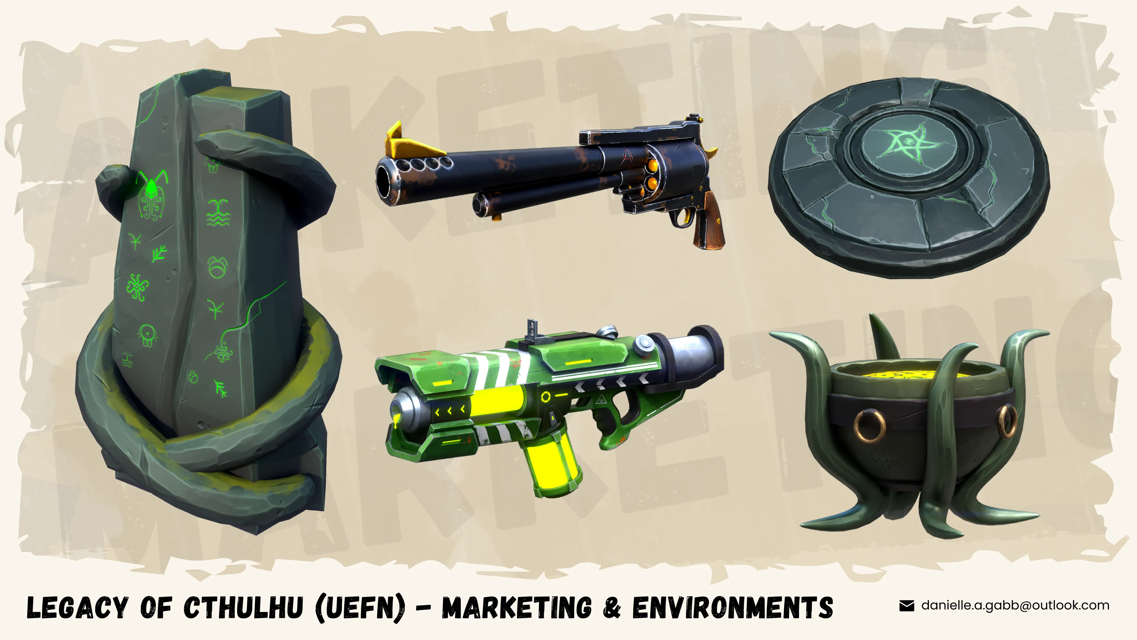 Character Creation: Designed and sculpted the lead character, Cthulhu, and the supporting enemy, Shoggoth. Tasks included high-to-low poly modeling, custom rigging, UV mapping, and texture painting, all tailored to Fortnite's art style.